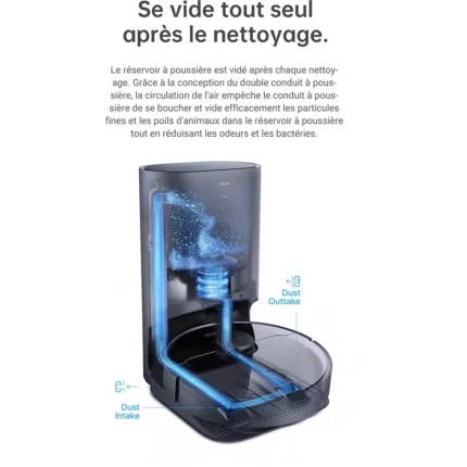 - Le + : Son aspirateur balai inclus qui se vide automatiquement dans la station de l’aspirateur robot
