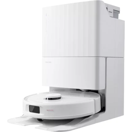 - Serpillère déportée : le robot est capable de nettoyer plus efficacement les angles et bords des murs en déployant sa serpillière vers l’extérieur.