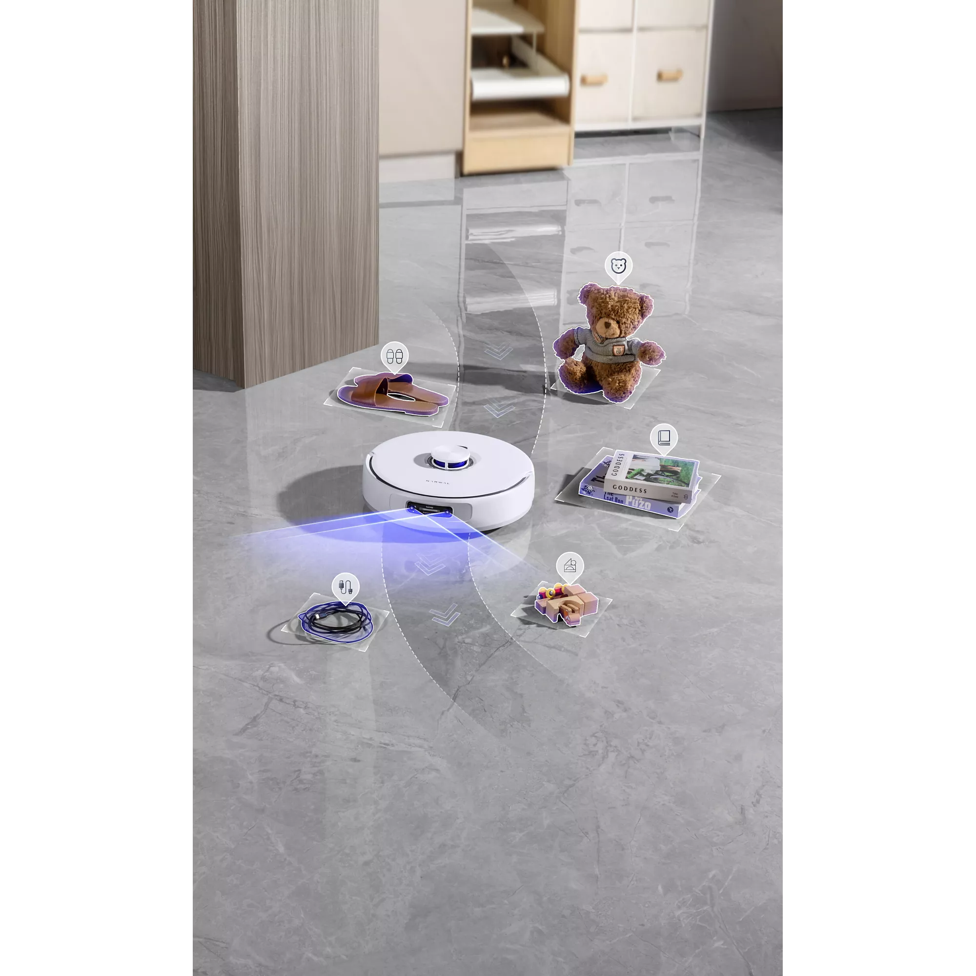 - Detection des objets en temps réel : Détection et reconnaissance précise des objets (1 cm), ne s’emmêle pas dans les câbles et évite les obstacles les plus petits
