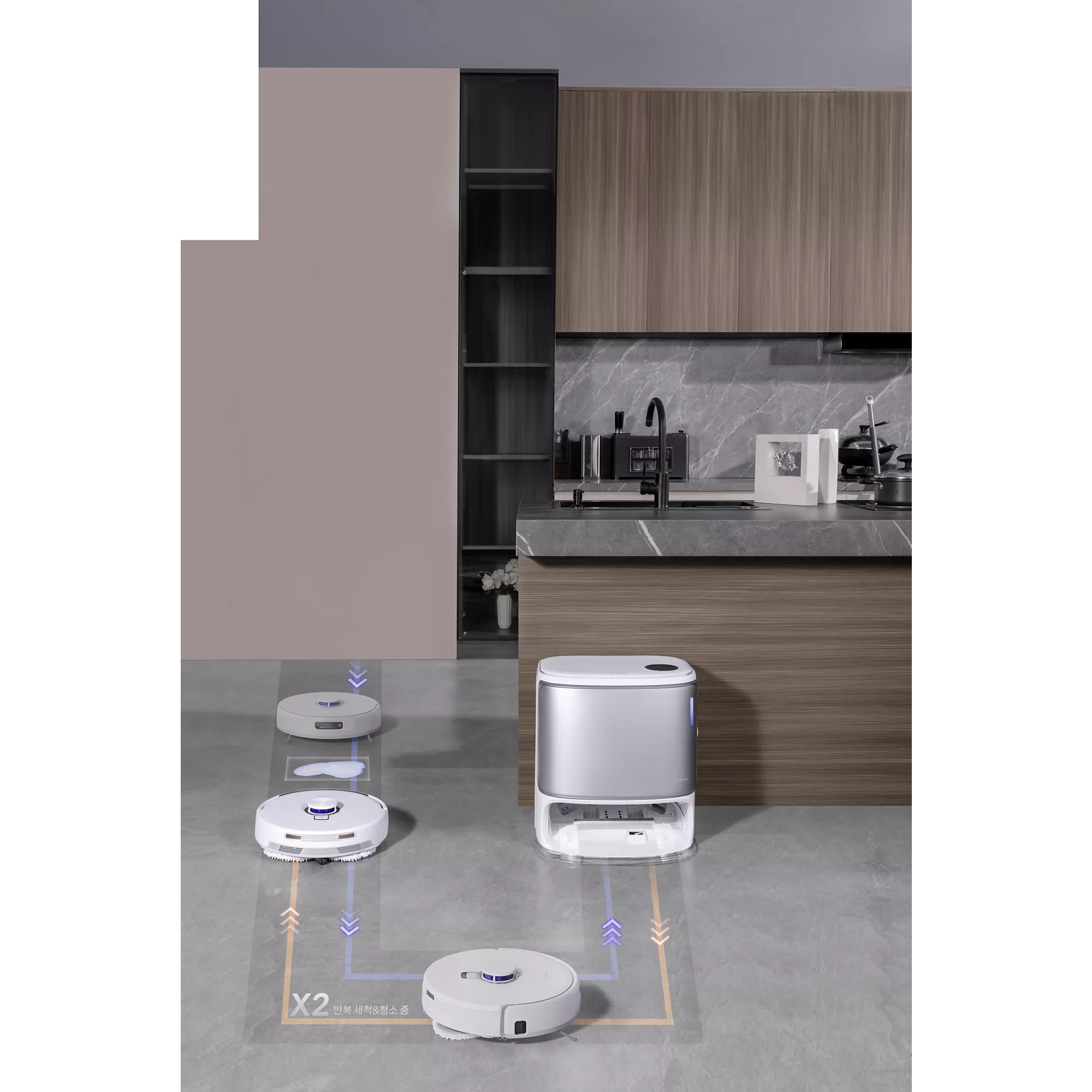 - Détection des zones sales : La caméra du robot détecte les zones sales et insiste dessus pour un nettoyage en profondeur avec les serpillières préalablement chauffées