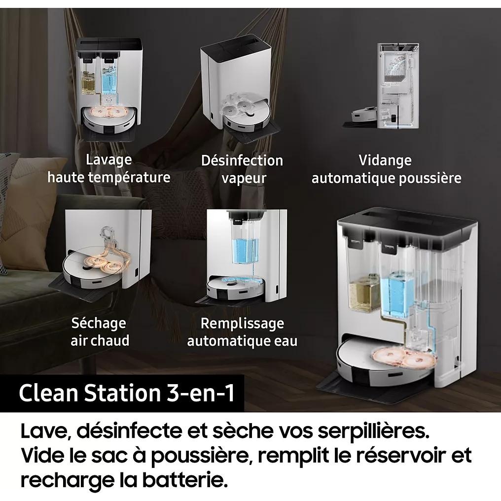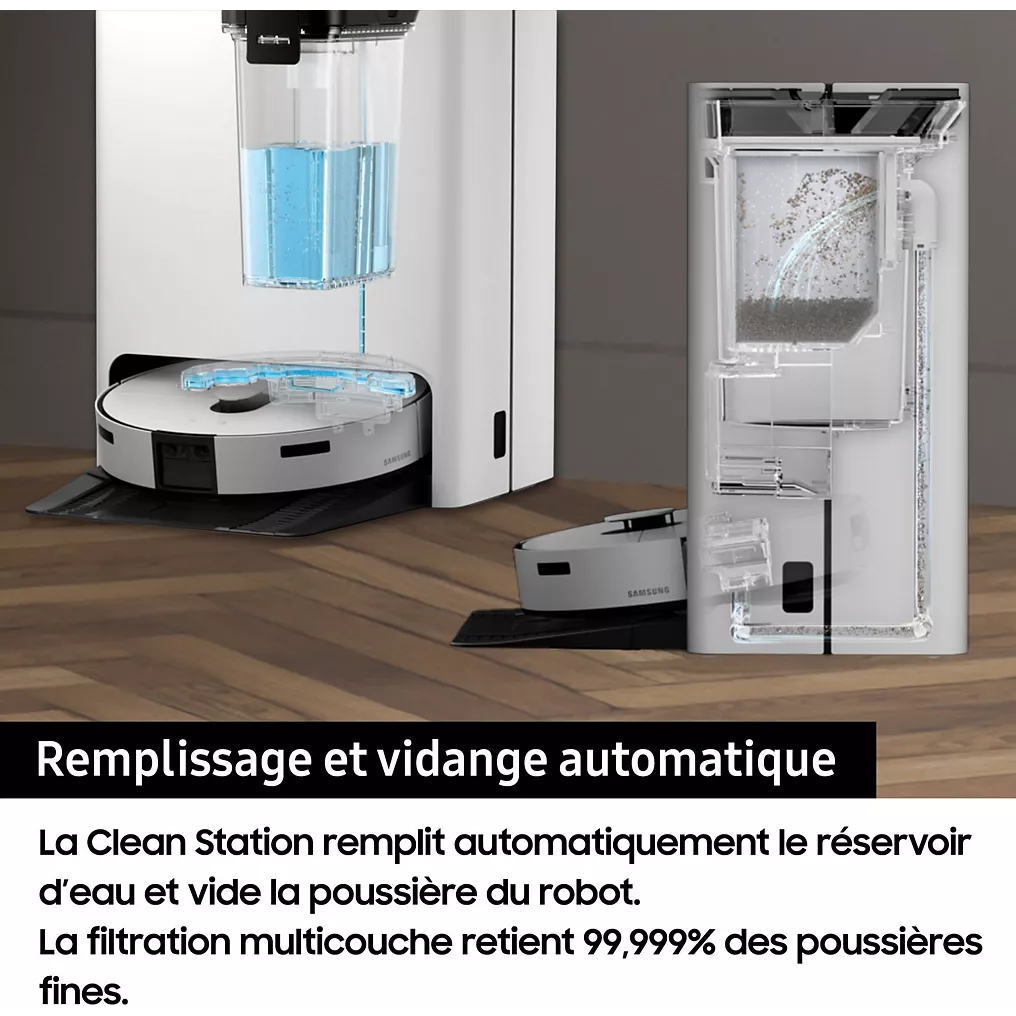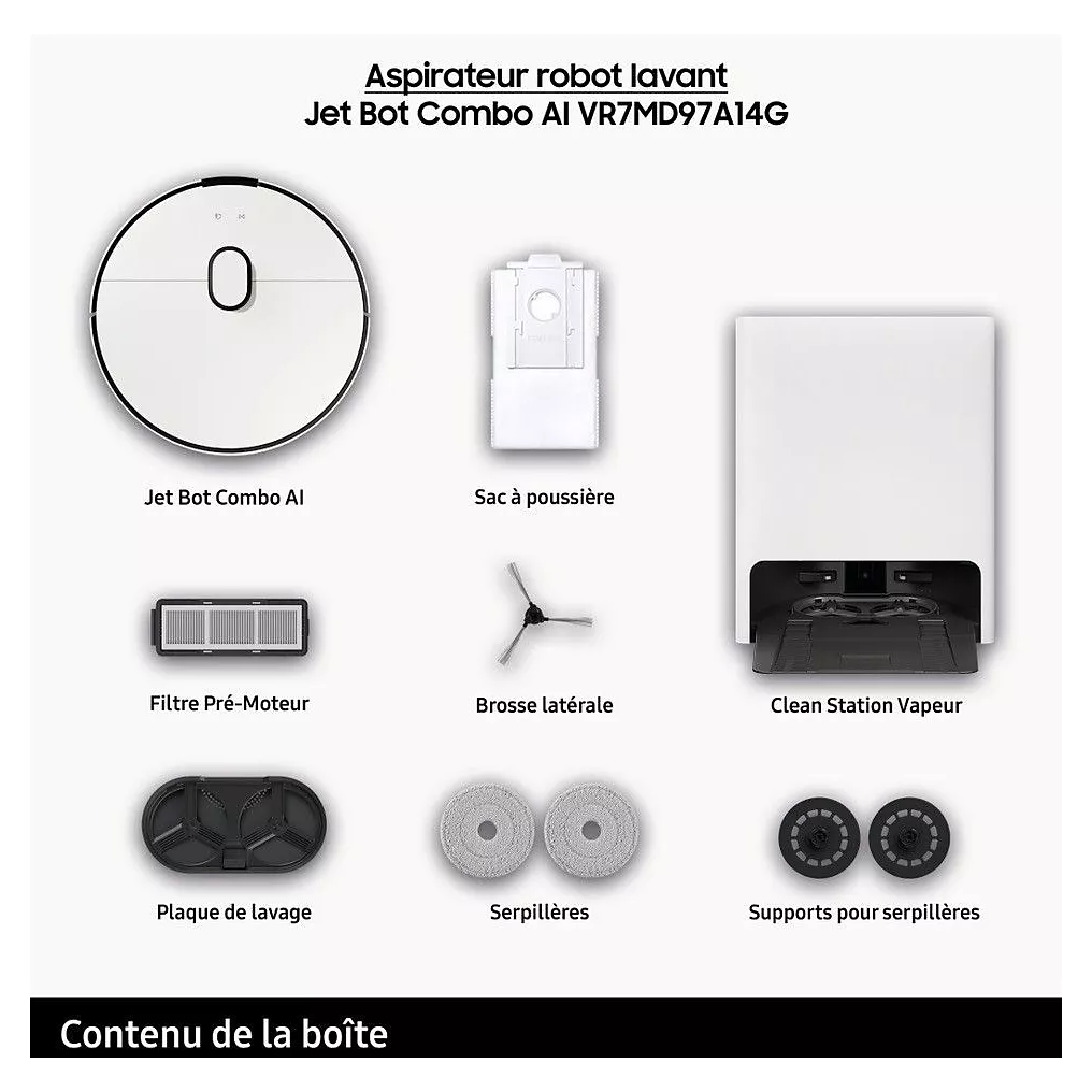 Découvrez l’aspirateur robot Samsung Jet Bot Combo AI VR7MD97A14G, un appareil intelligent tout-en-un qui combine aspiration puissante et lavage automatique pour un nettoyage précis et efficace de toutes vos surfaces.