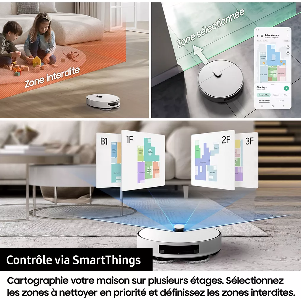 - Méthode de navigation : Cartographie 3D avec système de navigation personnalisable, zone spécifique à nettoyer, obstacles à éviter, trajectoire précise