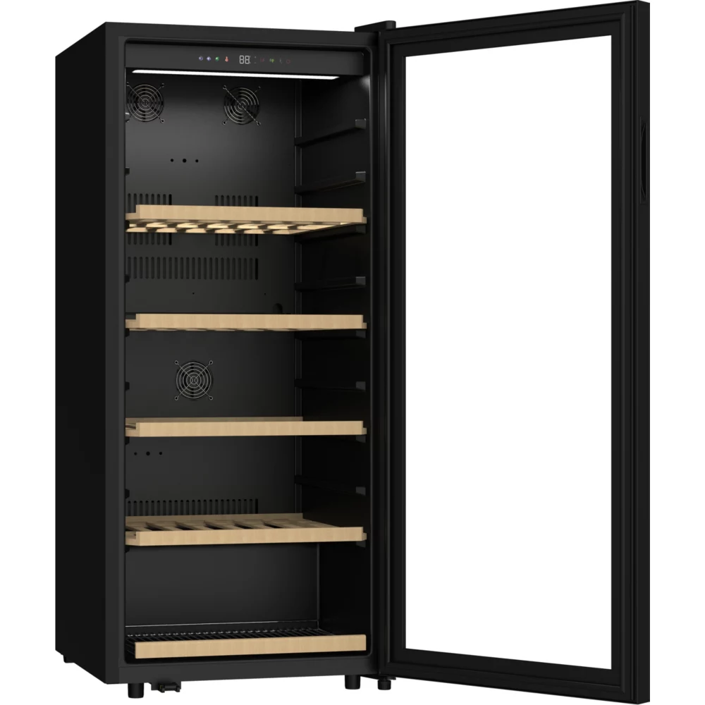 - Type de porte : vitrée, permet de visualiser facilement les bouteilles sans avoir à ouvrir la porte, ce qui réduit la circulation de l’air dans la cave et donc la variation de la température. Le traitement anti-uv protège le contenu.
