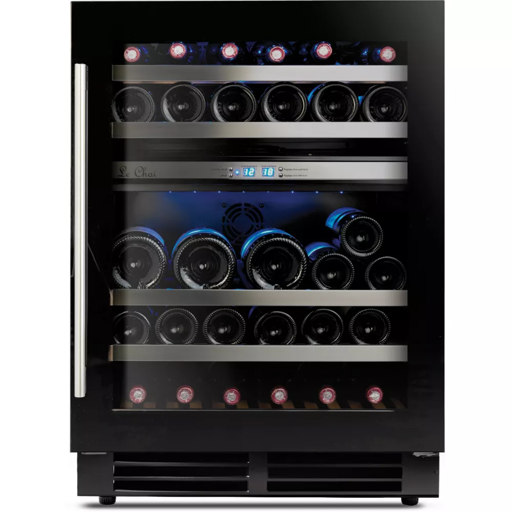 Offrez à vos bouteilles une conservation optimale dans un écrin élégant avec la cave à vin LBN160 signée Le Chai. Un volume utile confortable accueille 44 bouteilles dans deux zones de températures adaptées à tous vos goûts. Quatre clayettes et demi au fronton en inox accueillent confortablement vos vins favoris et un système de coulissement vous permet une utilisation simple et intuitive.