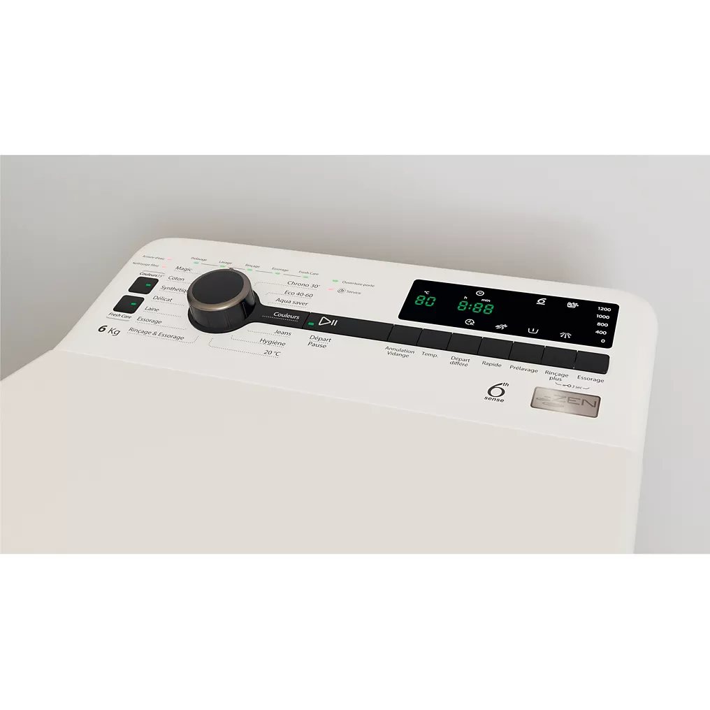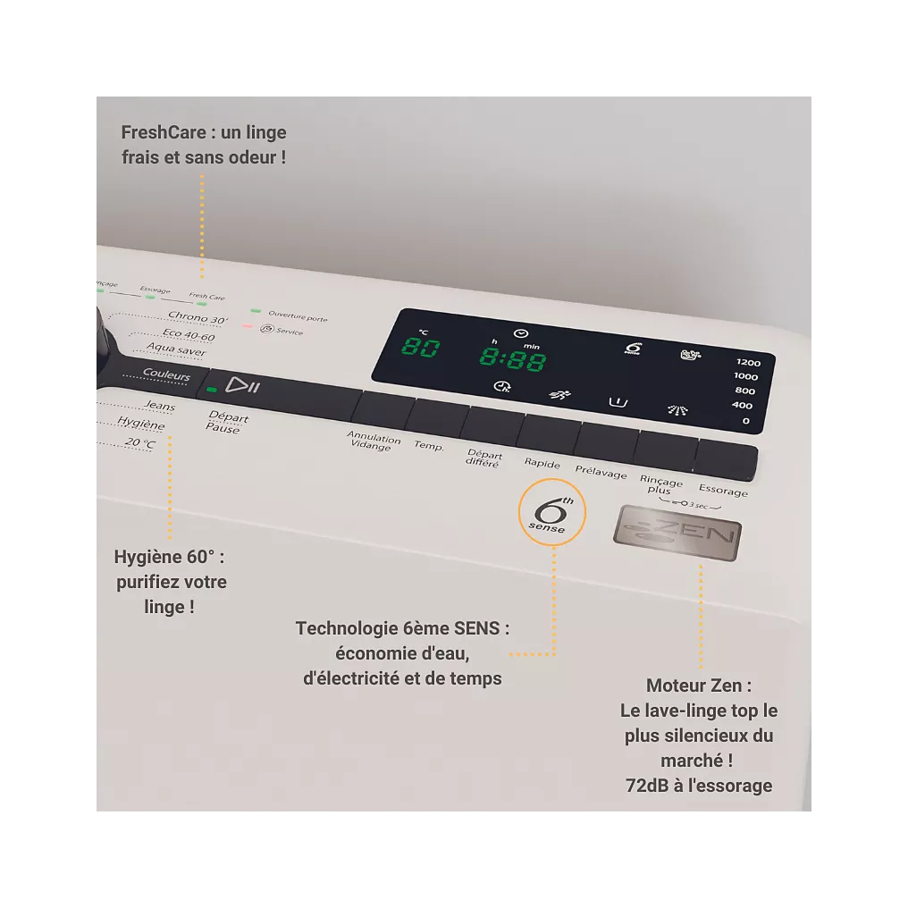 - 6ème sens : adapte la durée du cycle et la quantité d’eau à la charge de linge et à son type de fibre, ce qui permet de réaliser jusqu’à 50% d’économies d’eau, d’électricité et de temps.